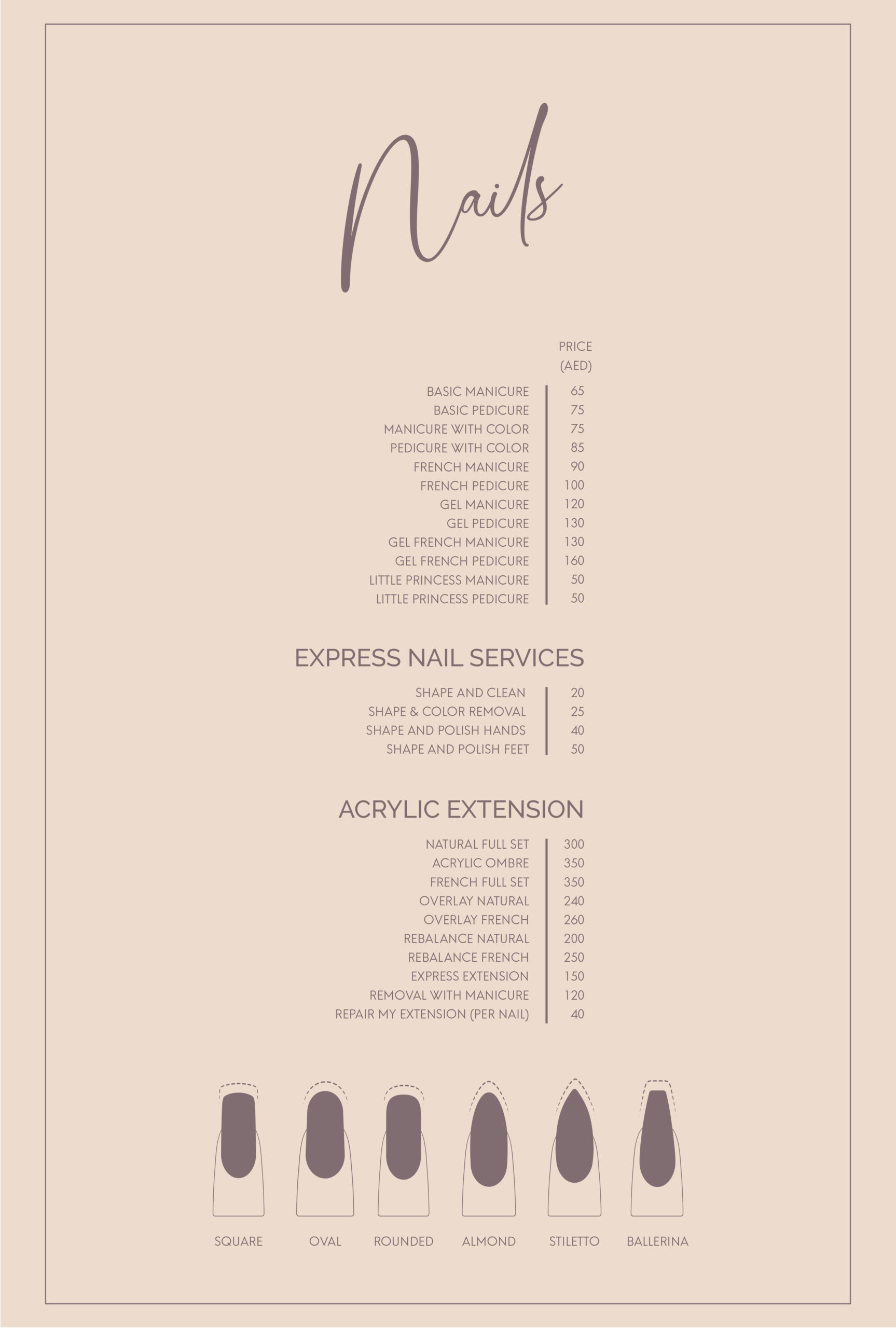 Our nail technicians have been professionally trained to consult the client and provide you with different nail shapes that best suit your nail length and fingers. We also go the extra mile by filling a nails form for each client before starting your nails service to meet your needs.